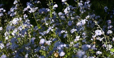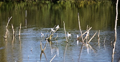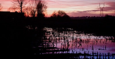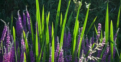 Éclairés en contre-jour, des feuilles de massettes et des fleurs de salicaires, avec des reines des prés.